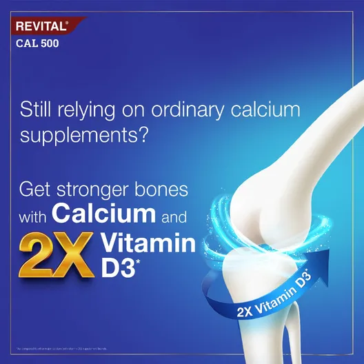 Does Revital CAL 500 have any side effects? No, Revital CAL 500 is safe when consumed as directed Should I check with my doctor before I use this product? If there is a history of kidney disease, kidney stones (past or present), heart disease, parathyroid disorder, or is pregnant or breast-feeding, it is advisable to inform the treating physician before taking Revital Cal 500. Avoid taking Revital Cal 500 if there is a known allergy to the ingredients. Also, avoid taking any other vitamin or mineral supplements that contain calcium or vitamin D without informing your doctor. Can diabetics/heart patient take Revital CAL 500? In diabetics, Revital Cal 500 can help in prevention of diabetic osteoporosis. However, informing the treating doctor about taking Revital Cal 500 is advisable. In patients with heart disease, kindly take advise from the treating doctor before consuming Revital Cal 500.