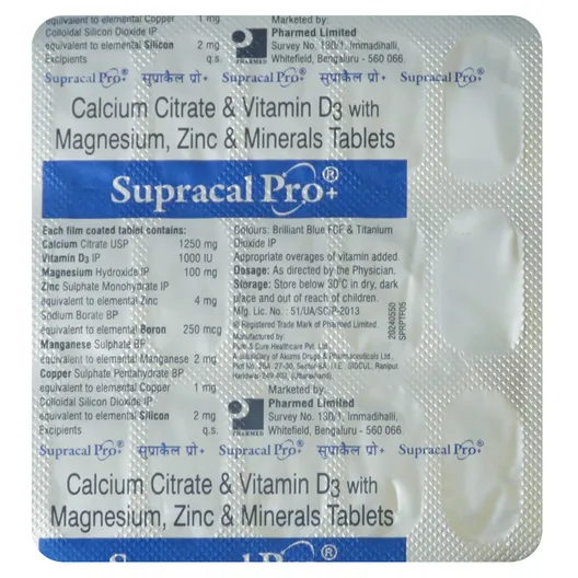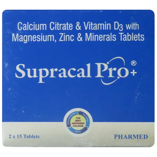 Supracal Pro Tablet is a nutritional supplement that promotes good bone health and prevents bone demineralization. It is used to treat osteopenia, osteoporosis, arthritis, and other fractures. It contains high-strength Calcium with absorption enhancers, such as Vitamin D3 (Cholecalciferol), Magnesium, and pro-bone minerals like Zinc, Manganese, Copper, Boron, and Silicon. It is also beneficial in conditions like cardio and diabetic diseases, skin disorders, and hormonal diseases.\